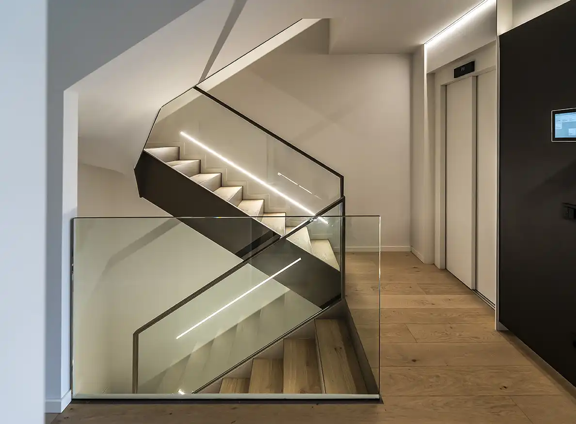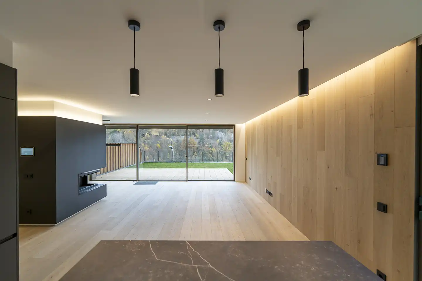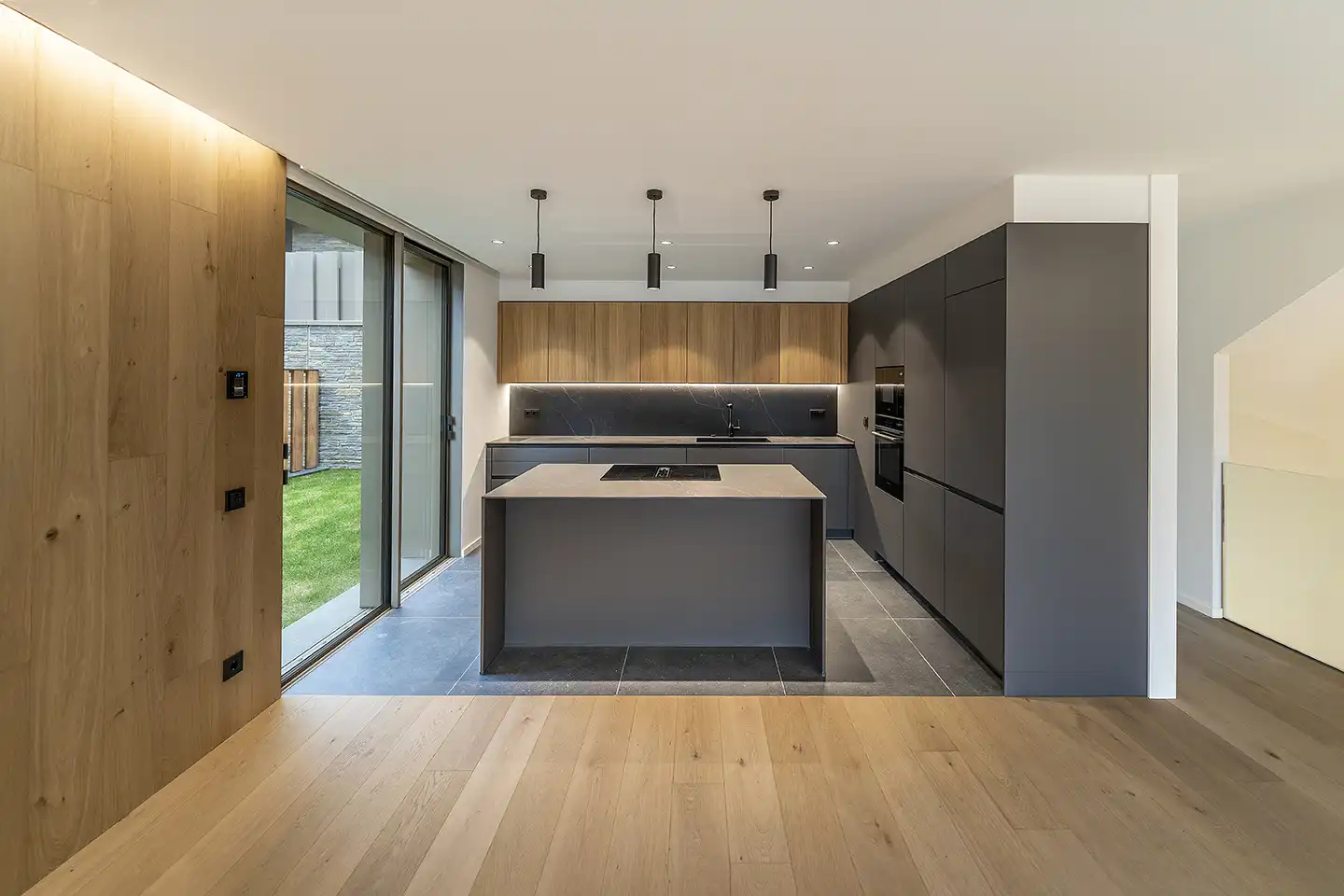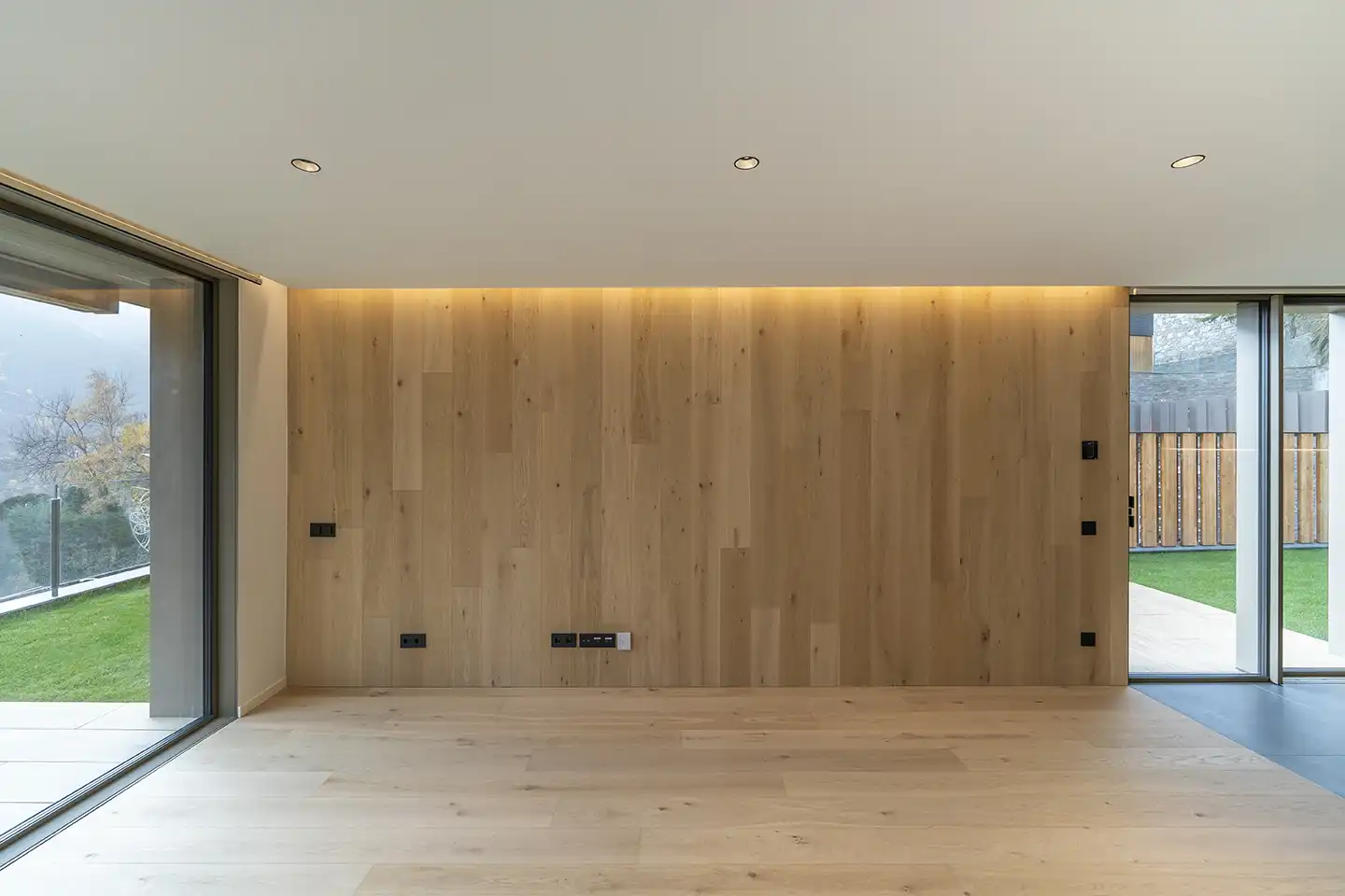 Els paviments de roure natural, fabricats per GRATO, proporcionen una calidesa que s'estén per tota la vivenda, creant una atmosfera acollidora i elegant. També s'han revestit parets i sostres amb fusta del mateix fabricant.La combinació dels materials amb el disseny del conjunt crea una fusió perfecta entre allò antic i contemporani, aportant valor al disseny interior.