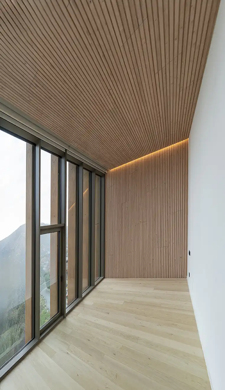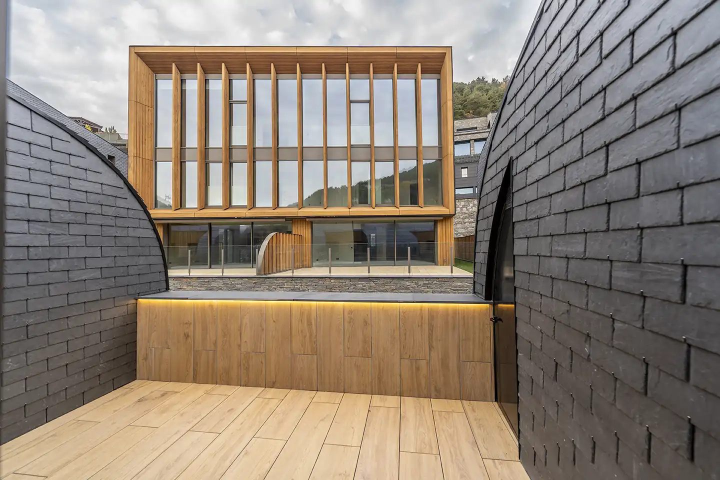 La pedra natural s’integra cromàticament amb els tons terrosos de l’entorn, establint un diàleg mimètic amb el paisatge. La fusta compareix com a presència estructural i tàctil —no com a simple revestiment— apel·lant a la memòria sensorial de l’arquitectura de muntanya.
