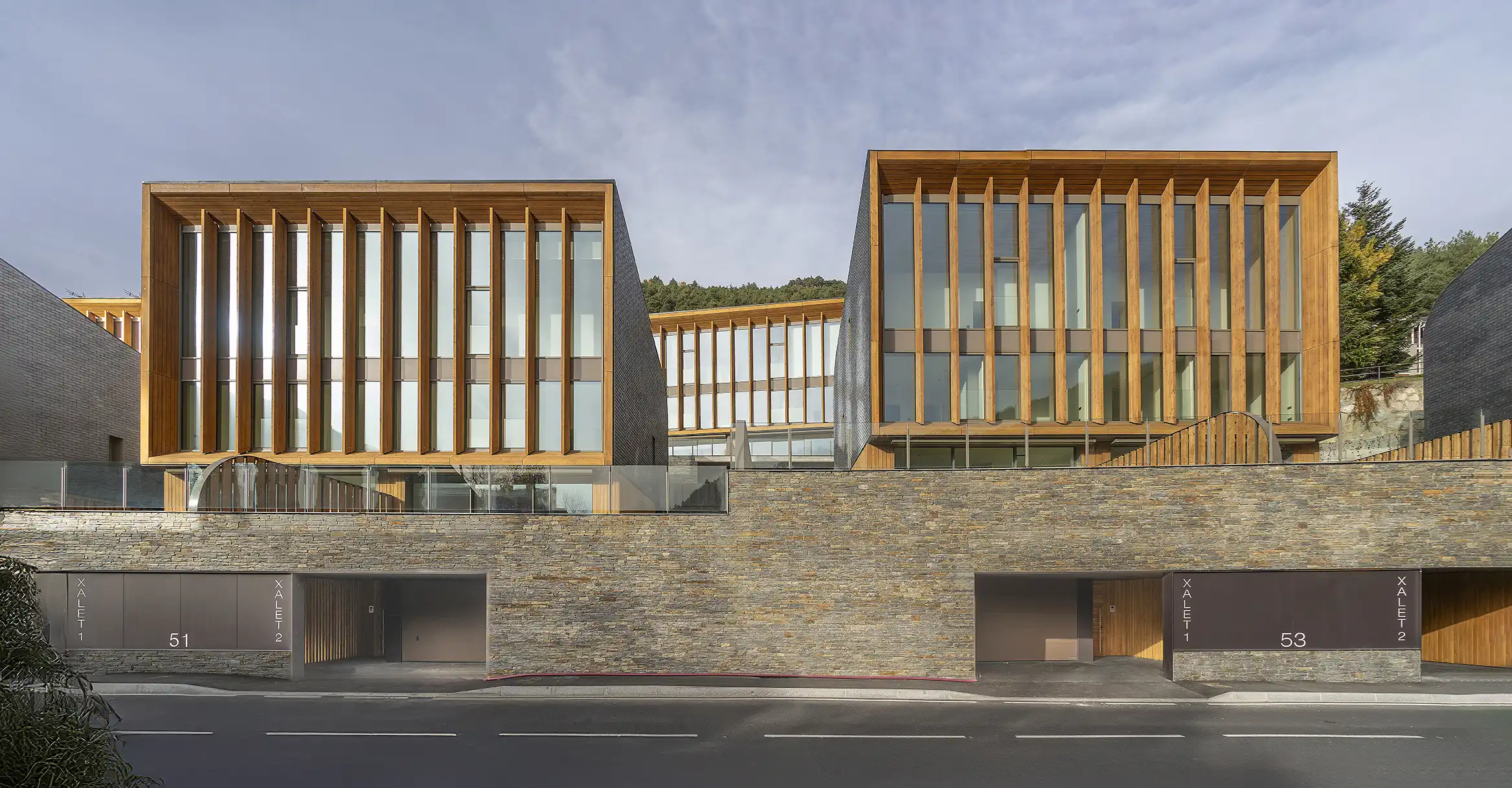 La composició formal combina un sòcol mineral de pedra amb volums superiors de geometria compacta, resolts ambun sistema de lames verticals que accentua la verticalitat i regula l’entrada de llum, reforçant la unitat del conjunt.