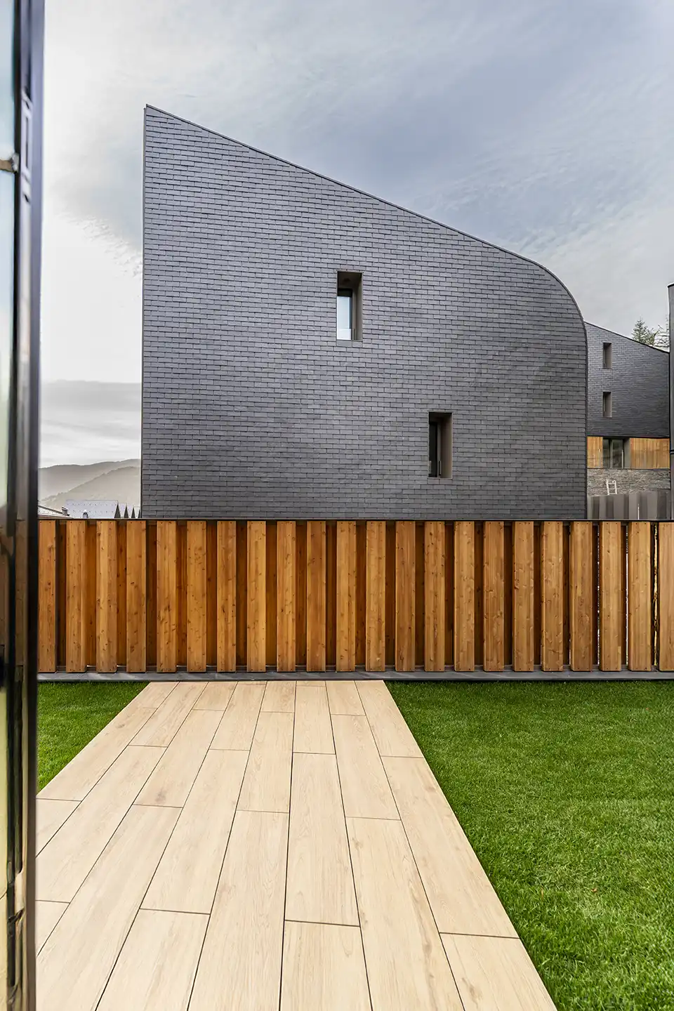 La composició formal combina un sòcol mineral de pedra amb volums superiors de geometria compacta, resolts amb un sistema de lames verticals que accentua la verticalitat i regula l’entrada de llum, reforçant la unitat del conjunt.